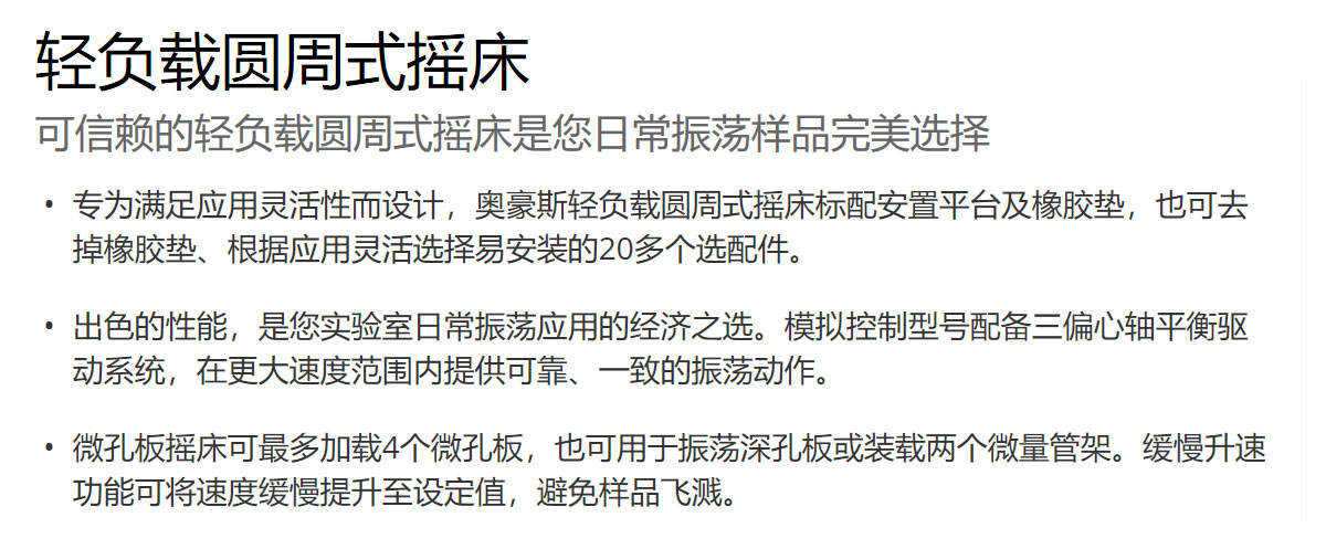 可靠耐用的奧豪斯輕負載搖床,樣品處理量高達3.6kg,根據(jù)圓周直徑和速度范圍選型,使您的樣品混合效果進一步優(yōu)化。數(shù)顯控制輕負載搖床專門用于振蕩微孔板,兩種振幅型號可選;模擬控制型號則為經(jīng)濟之選,滿足日常應用。所有型號配備三偏心軸平衡驅(qū)動系統(tǒng),微處理控制器確保振蕩動作可靠、一致。