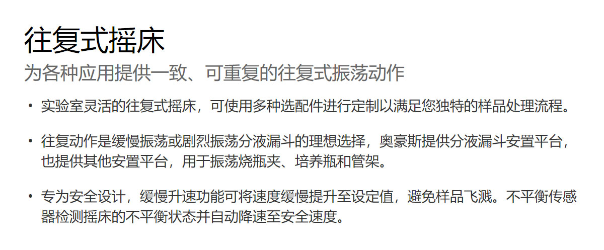 奧豪斯往復式搖床專為需要結(jié)果準確、重現(xiàn)性好的各種應用而設計,包括細胞培養(yǎng)和提取等,振蕩動作一致、均勻。振蕩動作行程長度19mm,永久潤滑的滾珠軸承及無需維護的無刷直流電機確保運行可靠、且連續(xù)工作。