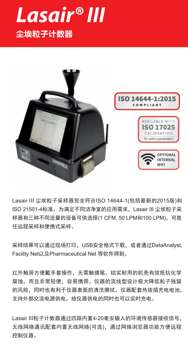 LASAIR?III空氣粒子計(jì)數(shù)器。機(jī)載脈沖幅度分析(PHA)確保這款計(jì)數(shù)器達(dá)到ISO21501標(biāo)準(zhǔn)。大尺寸紅外觸摸屏和直觀的用戶界面使系統(tǒng)很容易使用。結(jié)實(shí)耐用的機(jī)売抗化學(xué)腐蝕,而且非常輕便。機(jī)売的簡(jiǎn)潔設(shè)計(jì)可將粒子截留降至最少,同時(shí)有利于儀器的清洗擦拭。
