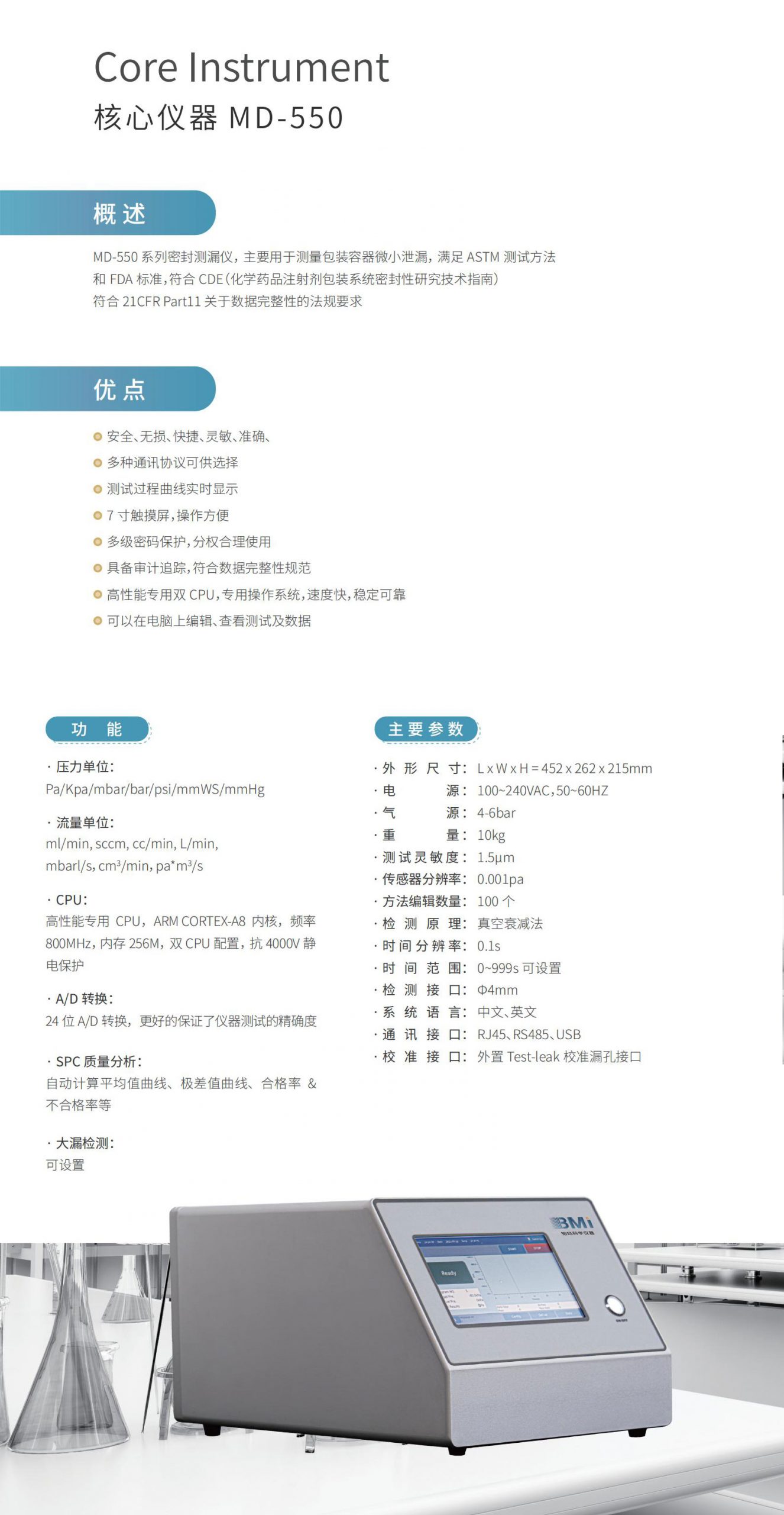 MD-550 系列密封測(cè)漏儀,主要用于測(cè)量包裝容器微小泄漏,滿足 ASTM 測(cè)試方法和 FDA 標(biāo)準(zhǔn),符合 CDE(化學(xué)藥品注射劑包裝系統(tǒng)密封性研究技術(shù)指南)符合 21CFR Part11 關(guān)于數(shù)據(jù)完整性的法規(guī)要求。